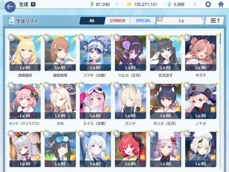 EXスキルに続いて生徒Lvも引き上げ、Lv80の生徒を全員Lv85に上げた。そしてLv85の生徒は現在54人に、生徒ひとりを85から90に上げるには上級レポートが200ちょっと必要、計算してみたらギリギリ足りる数のレポートを所持していることが判明、が、クレジットはまったく足りないし、クレジットを使い切ってしまうわけにもいかないので、今後の特別依頼2倍期間はクレジットをとにかく周回しよう。