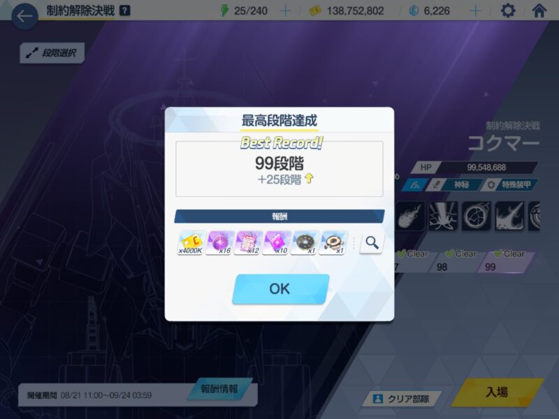 制約解除決戦コクマー特殊装甲、らびらびらびっと先生の動画を参考に99段階をクリア。動画よりもだいぶ育成が進んだ状態で挑んだために全然違うタイミングでフェーズ移行してしまい、最後は完全にアドリブだったけれど、53秒残しで余裕の勝利だった。ついでにイブキの装備がすべてT9だったのでT10に更新しておいた。