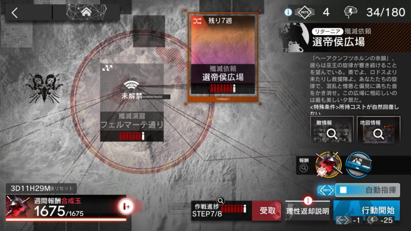今週から始まった殲滅作戦『選帝侯広場』、昨日まで理性はすべてイベントにまわしていたので、今日初プレイ、ウルピアヌスを拠点前の左レーンに配置すると被ダメ時回復でとんでもないことになるステージ、ウルピアヌスに頼りきりでいけるかと思ったら右側が途中で決壊して撃破398という結果に。まぁとりあえず初週はこれで……。