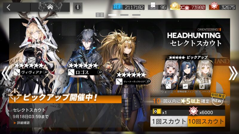 セレクトスカウト、未招集星6オペレーター3人が選択できるというまたとなさそうな機会なので、星6ひとりくるまで回す。本命は灼熱損傷のヴィヴィアナ、次点で攻略動画でよく採用されているロゴス。