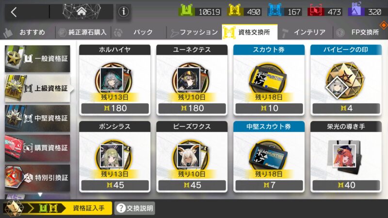 そしてなんと資格交換所の方もホルハイヤとポンシラス、未招集のオペレーターがふたりきてた。上級資格証も十分溜まっていたのでこちらも招集してしまう。浮遊状態はまったくと言っていいほど触れたことがないのでどれくらい有用なのかわからないけれど、統合戦略でたまに浮遊状態バフみたいな効果見かけるし、いつでも招集できる状態にしておきたい。ポンシラスの方はYouTubeの優秀なオペレーターまとめみたいな動画でけっこう名前を目にするのでこちらも育成したい……。