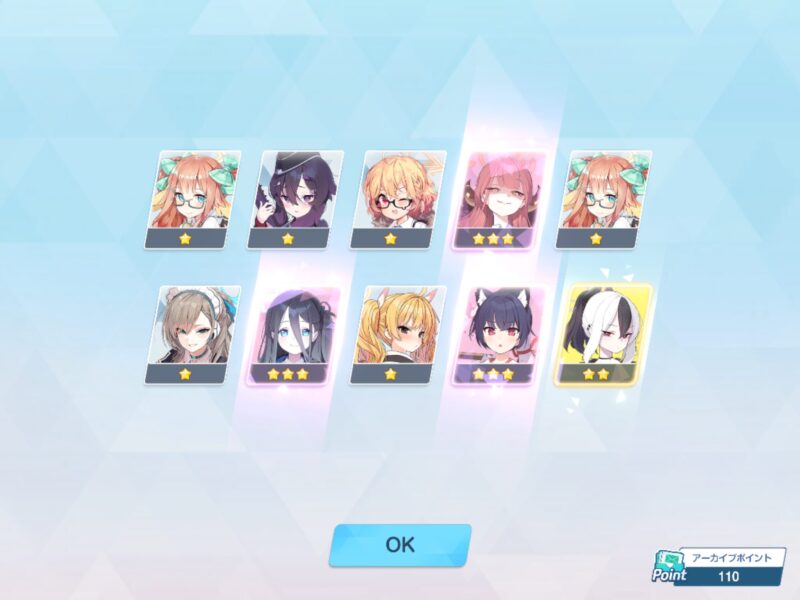 生徒一覧見ていたら固有2のままだったチェリノが目に入り、唐突にアーカイブ募集を天井まで回してしまった。途中星3生徒3人来てくれたりで合計150回で8人くらい来てくれた(ちゃんと数えてなかったけれど)、固有2だったシロコも1回来てくれて、神名のカケラも4,200くらいまで補充できたので、急に固有4まで上げたい生徒とか出てきても大丈夫そう。