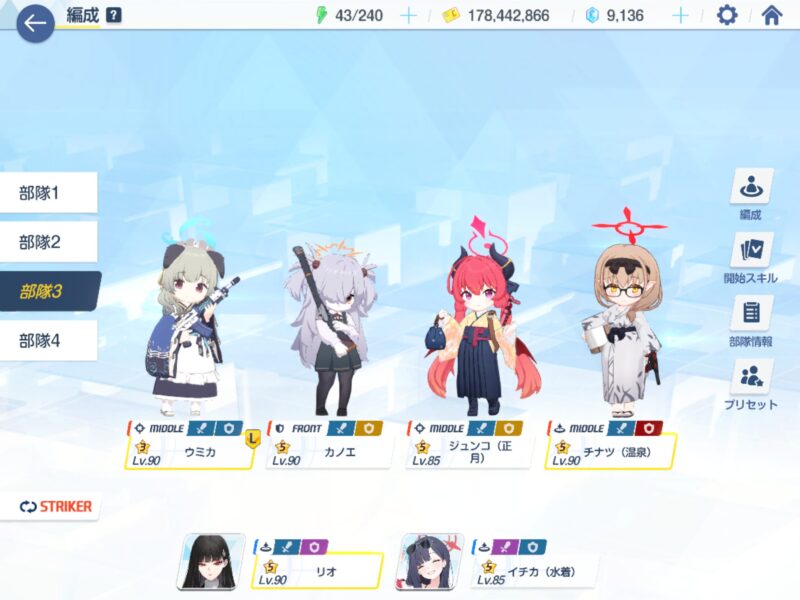 次のアップデート内容にウミカの愛用品追加があったので、なんとなくウミカが主役な編成を考えてみた。ウミカとリオでとにかく砲台を設置して、チナツで攻撃速度を上げて砲台の発射間隔を小さくする。カノエとジュンコ(正月)は攻撃属性を合わせつつコスト回復と攻撃速度系アタッカー(なおかつEXスキルが低コスト)で選んだけれど、ウミカの強化だけを考えればここは別の生徒になりそう。あといまだにバフの細かい仕様を把握しきれていないので、ミモリ(水着)のEXとチナツ(温泉)のEXが重複するかどうかわからず、結局デバフ能力持ちのイチカ(水着)に。