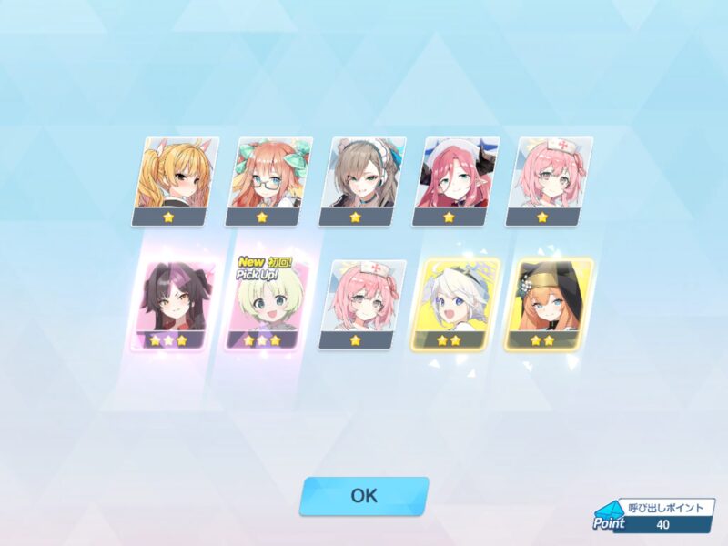 130連でダブルピックアップを終わらせた前回に続いて、今回は40連でリツとおまけにカスミも来てくれた。10月末は毎年限定募集が来ているらしいので、現時点で青輝石10K残っているのはだいぶ心強い。