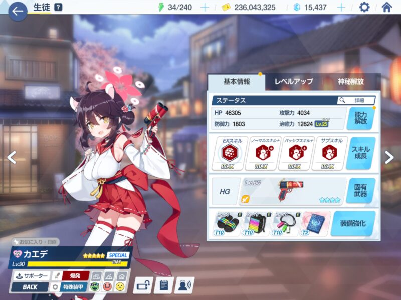 今日も大決戦レアコインを消費してカエデを固有4へ。ついでにノーマルスキルとネックレスも強化。シールド性能の高さでけっこう出番のある生徒で、数少ないロリ巨乳生徒、強くできて嬉しい。