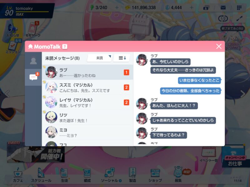 ラブの絆ストーリー読了、ラブに対する先生の態度が何かおかしい、イオリらに対する態度と同じ、遠慮なくからかっていくパターン。こういう関係性の生徒がメインストーリーなんかで再登場したときに、先生と息ぴったりの活躍を見せたり、珍妙なトークを繰り広げるの大好きなので、またメインのどこか、大事な場面で駆けつけてきてほしい。モモトークしたとたんに先生の足音が聴こえてくるのちょっとしたホラーだ。