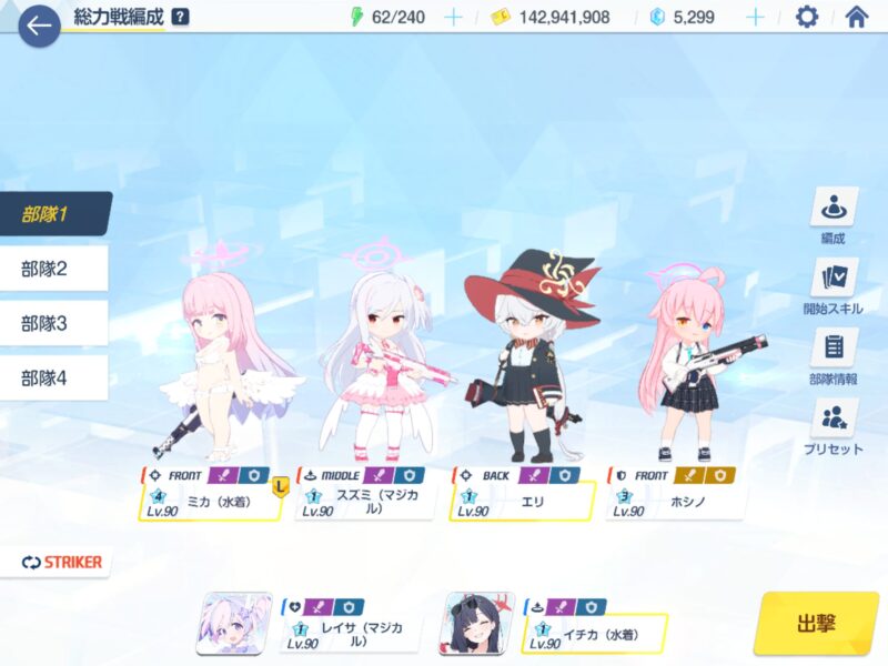 こんな編成で初日は消化、後半は総力戦らしからぬ、地味な感じ?もしかすると高難易度ではギミック追加されたりするのだろうか……。とはいえ、CC、バフ、集中砲火と、必要な生徒が多そうなので、ギミック方面の難しさに特化した総力戦なのかも。Extremeくらいは自力でクリアしたいところ、その上は2部隊編成でちゃんとやらないと厳しそうだし、いつもどおり凄腕先生方の動画に頼ろう。
