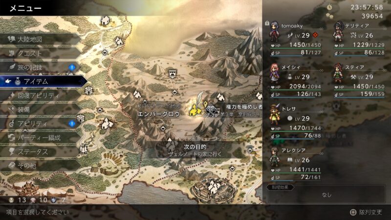 メインストーリーを進めたからか、影響力が条件を満たしたからか、エンバーグロウでデリティアが仲間にできるようになっていた、さっそく仲間に引き入れて主人公の後ろに配置。これでデリティアを火力寄りの装備で固めれば主人公をヒーラーにしても火力不足には陥らない。まずは強い弓を手に入れないと……。