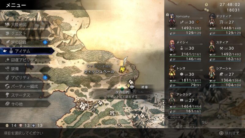名声を極めし者をクリア、クリア後の劇場でシアーシャを仲間に。ちょっと不思議な雰囲気のキャラクター、初めての扇が使える仲間……、が、当然扇以外の武器を優先して買い集めていたので装備は弱いまま。まぁ本分は味方の支援のようなので武器は微妙でも活躍できそう。列全員にHPとSP自動回復を付与できるのすごく強い、開幕にかけてすぐ後列にさがれば実質ノーコストだし、縁の下の力持ちとしてパーティを支えてもらいたい。