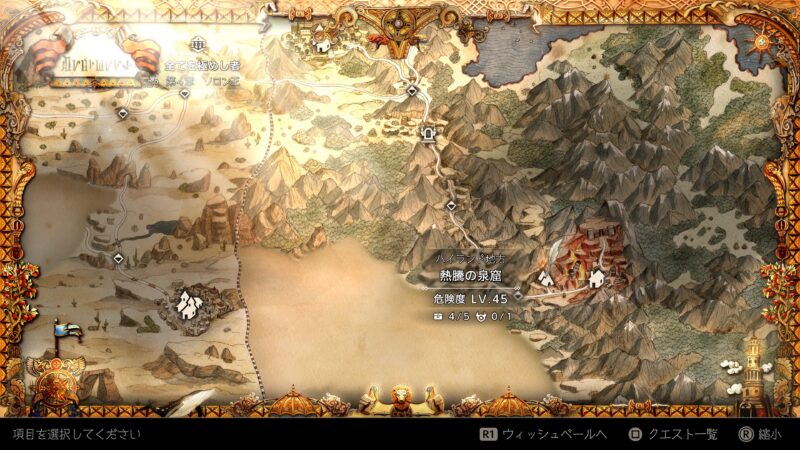 シンボルエネミー1体発見、しかしダンジョンのレベルが高く、通常エンカウントの敵相手のバトルでも戦闘不能者が出てしまう……。挑戦するのは後回し。あとは船で探索できる範囲に1体でもシンボルエネミーがいてくれれば念願の青宝箱が解放される。船の解放はお金80,000、もしかすると船大工を探し当てれば節約できるのかもしれないけれど、今行ける範囲にいるのかどうか……。