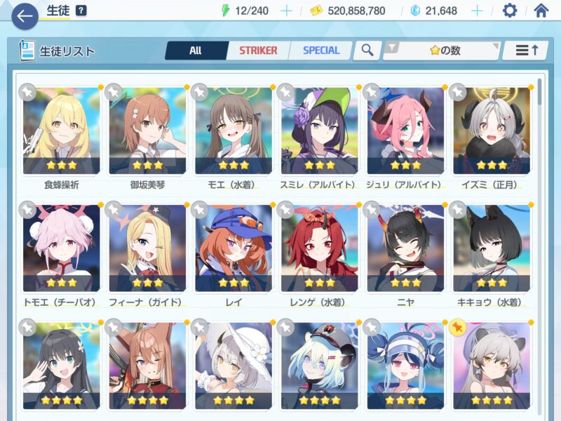 今日も今日とて日課だけ、生徒一覧を見ていたら星3生徒12人を星4に引き上げたくなってしまった。レンゲ(水着)は星2だからそのうち自然と上げられるとして、残り11人。神名のカケラは当然足りないし、フェス募集で獲得する分は絶対にフェス限定生徒の星上げで消えてしまうし、……やはりすぐには上げられそうにないか、星3確率2倍のタイミングでうまいことこの11人が来てくれることを願うしかない。