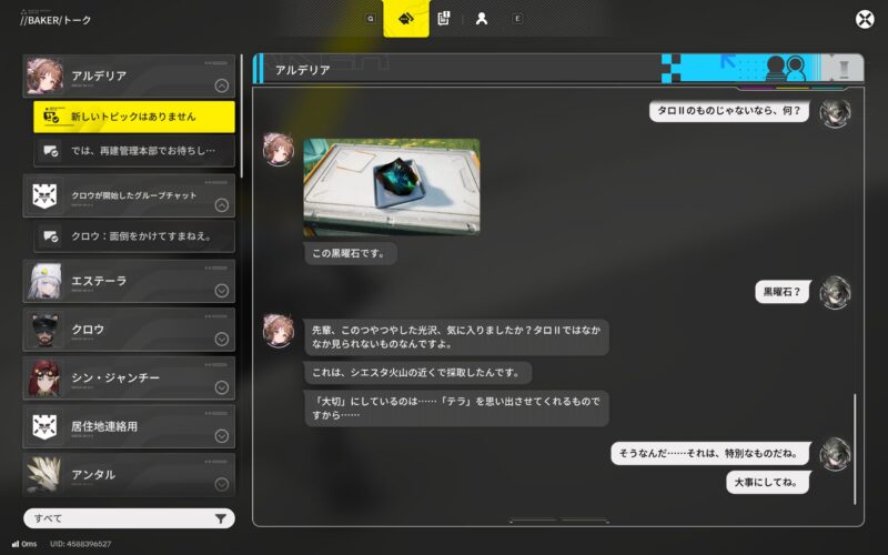 テラとタロIIをつないでいたスターゲートが損傷してから100年以上経ってるって理解していたのだけれど、アルデリアが『シエスタ火山の近くで採取したんです。』って言ってるのはどういうことなんだろう、自分で採取したわけではなく、誰かが採取したものが過去にタロIIに持ち込まれて、それが巡り巡ってアルデリアの手元に流れ着いたのか、はたまた設定を勘違いしているのか、または翻訳ミスか……。このへんはアルデリアのプロファイルを解放すればわかるのかな?再旅者の設定もいまいち理解できてない、身体はほぼほぼオリジナルと同じで記憶やら何やらは別人、みたいな理解でいたけれど、どうなんだろう。