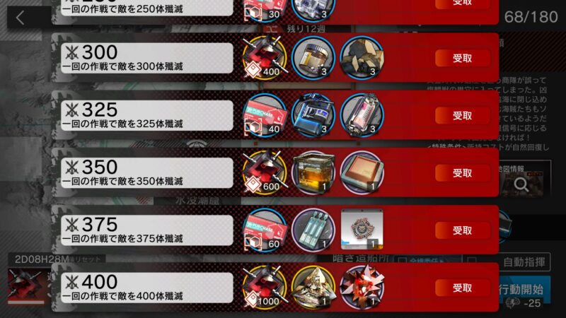 谷地通路の拠点の自動作戦レベル3をようやくクリア、武陵で製造できるようになる戦闘設備を導入したら楽勝だった。あとは源石研究パーク、あっちはレベル4もあるのにまだ3もクリアできていない。