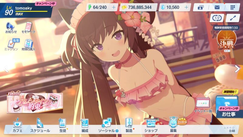 日課だけさっとこなした。ゲーム開発部のイベントとバレンタイン、どちらもクレジットがおいしいのでこの機に稼いでおきたいところ。